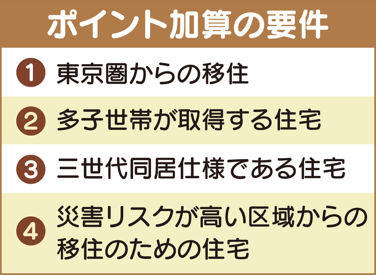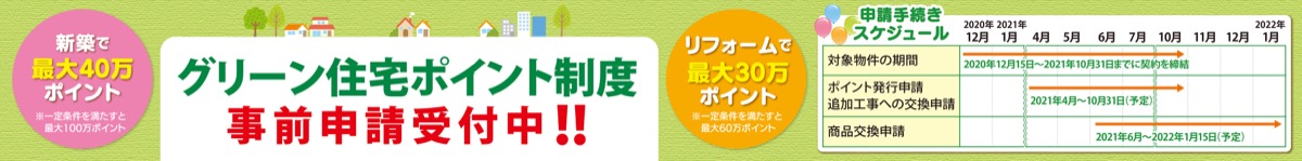 また、「グリーン住宅ポイント制度」は新築にも適用される。付与ポイントは東京圏からの移住等、4つのいずれかの要件を満たすと最大100万ポイントが付与。テレワークなどに最適な生活機器とも交換可能だ。