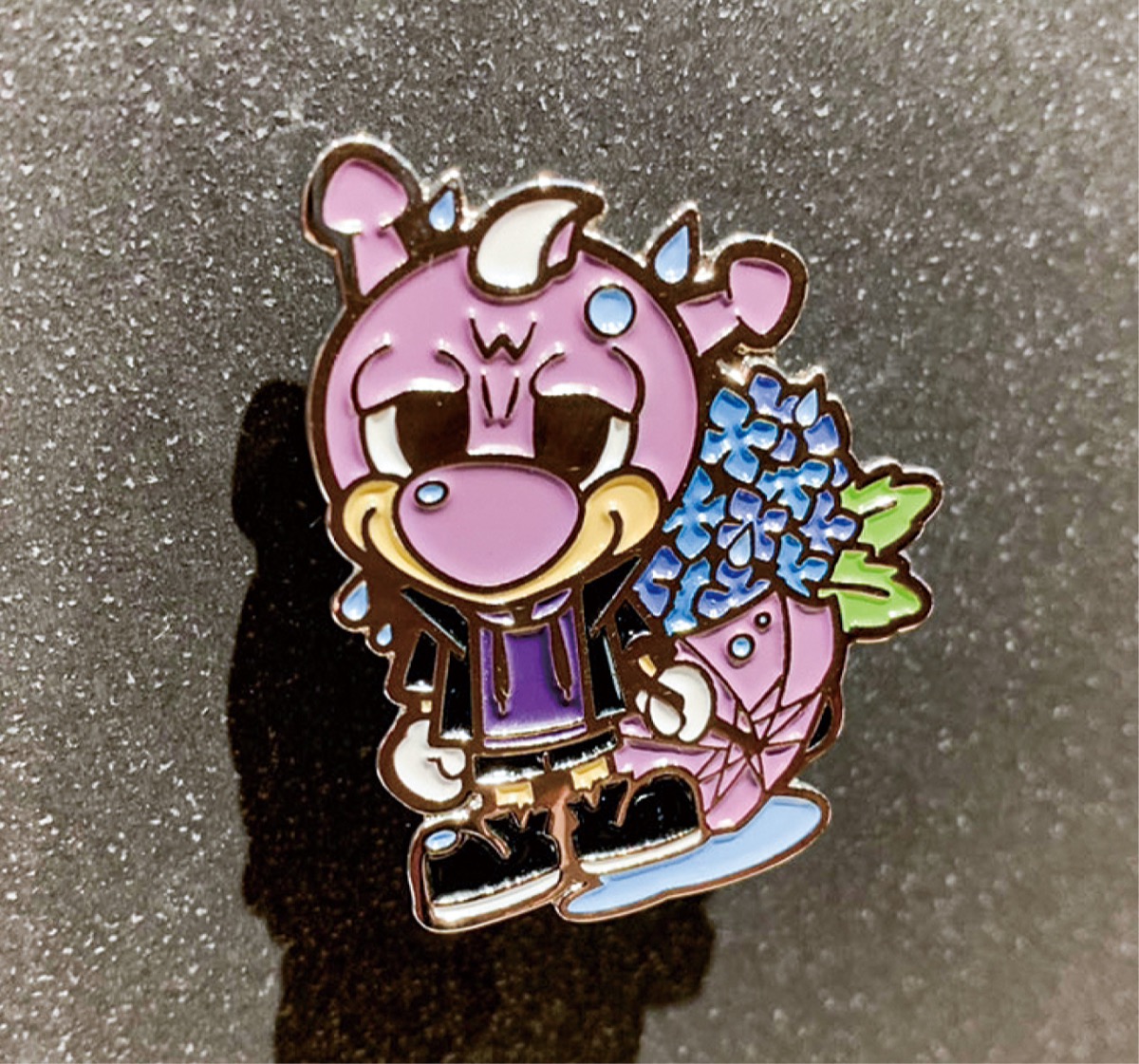 ピンバッジは同クラブのマスコットキャラクター「ワルンタ」をデザイン。雨が降っているのにも関わらず傘を差さない姿を表現する。