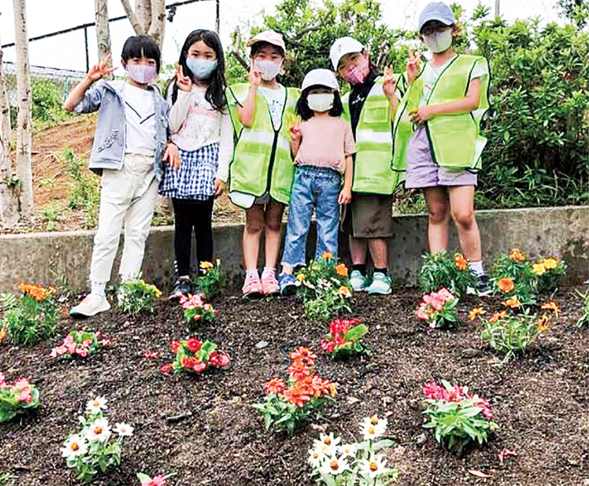菅生台自治会(黒澤克實会長=人物風土記で紹介)が5月29日、菅生第4公園で稗原小の児童と共に花壇を作った。