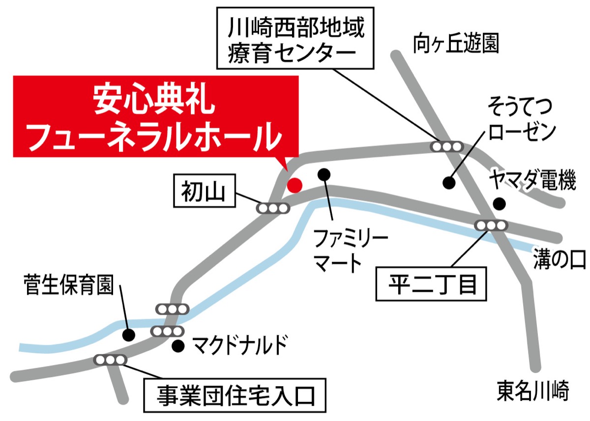 初山の交差点そばにある葬祭場「フューネラルホール」=写真下が先月、リニューアル1周年を迎えた。宗教・宗派を問わず利用可能。収容可能人数は約30人、近年需要が多くなった家族葬・1日葬・直葬などのシンプルな葬儀に最適なスぺースだ。消毒、換気等コロナウィルス対策も実施しているので、安心して利用できる。