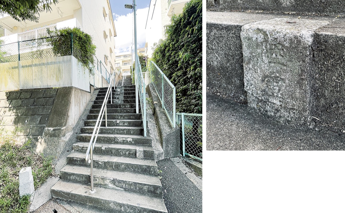 中原区の平和館に展示されているほか、今も区内に残っているものもある。写真は宮崎第一公園から南側、尻手黒川線に向かう階段。左の写真左下に一本据えられているのを見ることができるだけでなく、階段の一部にも埋め込まれている。長きにわたり境界標を調べている『東部62部隊を語り継ぐ会』をもってしても「なぜ埋められているかはわからない」。