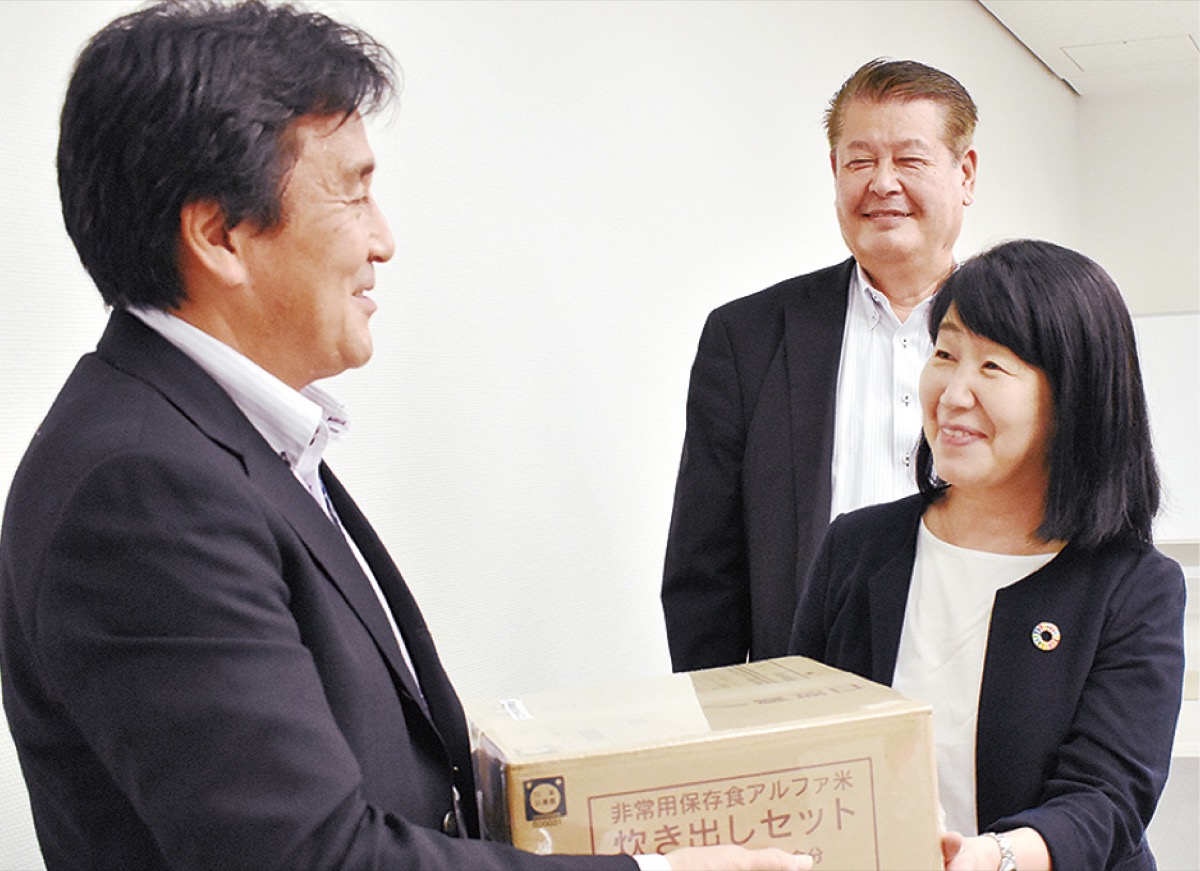 今年も、活用が見込まれる施設に希望数を募り寄付。区内では菅生保育園など4施設に届けられた。奥村副会長は「試食会などを行って、実際に食べてみる機会を頂いた。災害に備える意識が高まった」と話した。同事業場の中山紳一さんは「我々の資源が地域の役に立てばうれしい。社内にまだアルファ米はあるので随時提供していきたい」と話した。