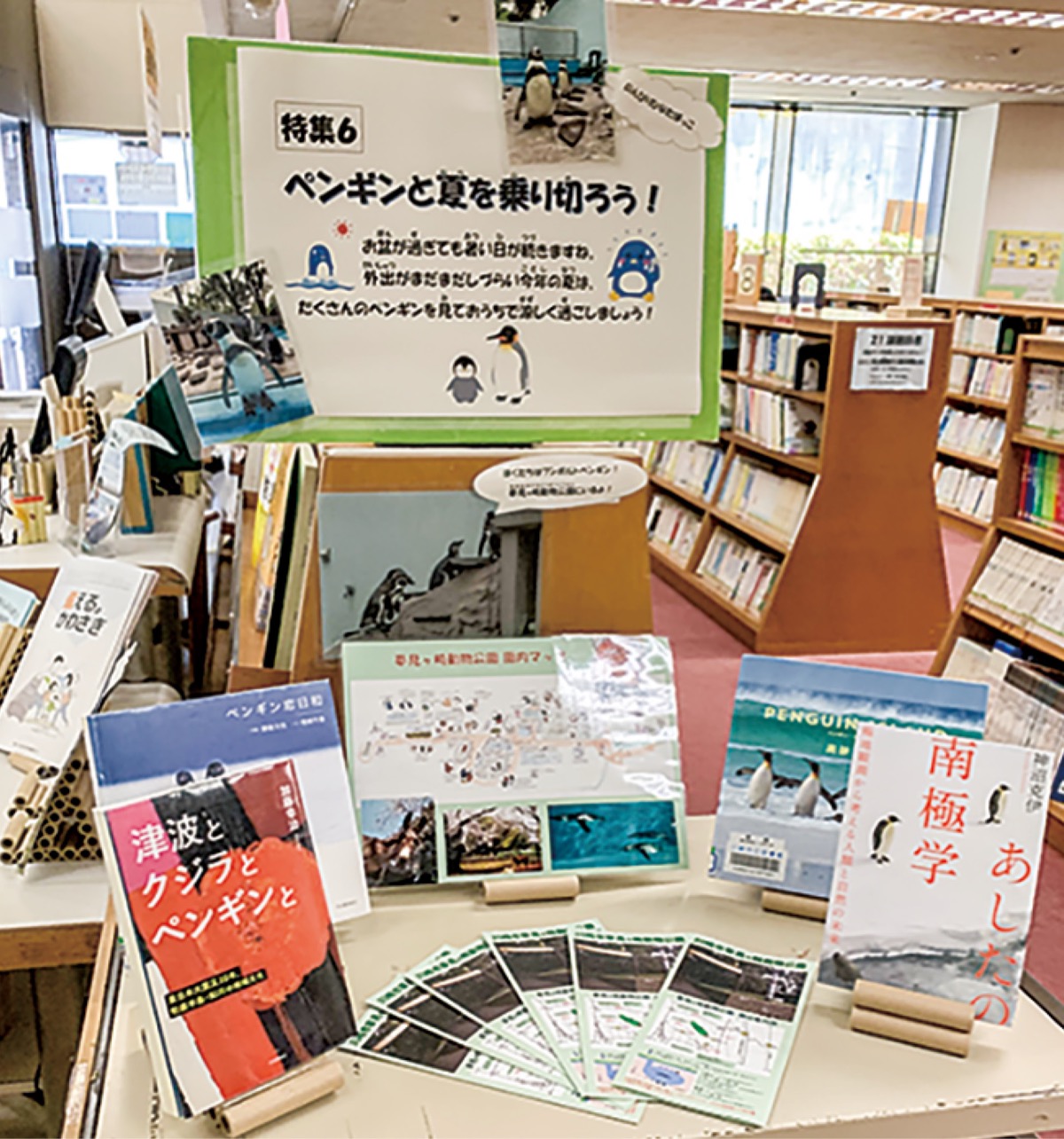 宮前図書館(岡野正志館長)は9月14日まで、「ペンギンと夏を乗り切ろう」と題したコーナー展示を行っている。