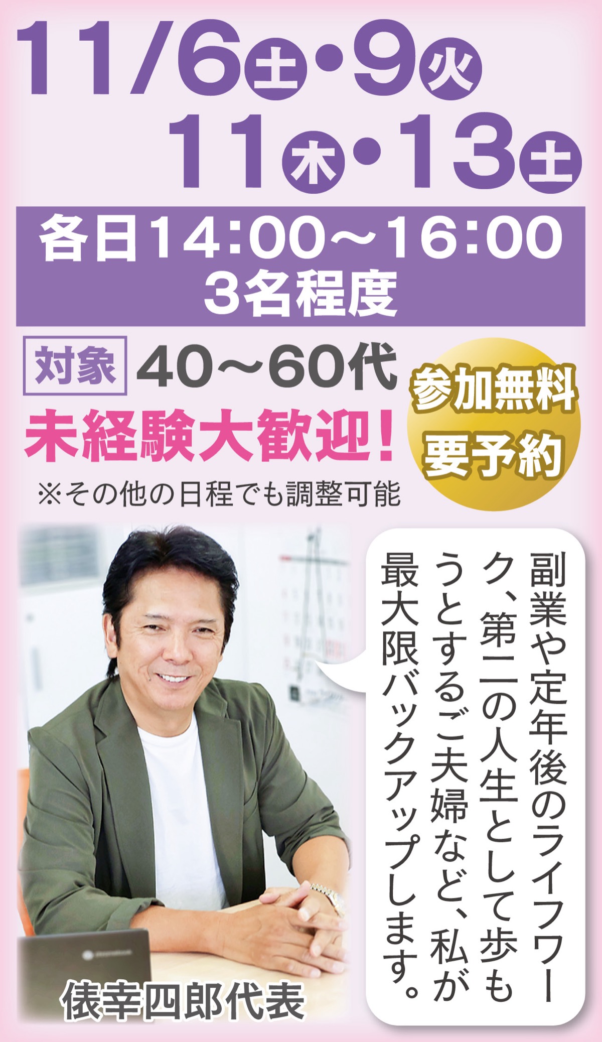 未婚・晩婚化が進む現代において需要が高まる仲人業界。これまでの人生経験を活かし、少ない資金で開業する方法やマッチングのコツなどが学べる。講師は横須賀市で「Arch結婚相談所」を運営する俵幸四郎代表。自身も50歳まで営業職だったが「自分だけでなく多くの人を幸せにしたい」と、業界のパイオニア的存在である全国仲人連合会に加盟し、開業に踏み切った一人だ。セミナー参加者が興味を持てば、同所の分室として場所を問わず開業可。