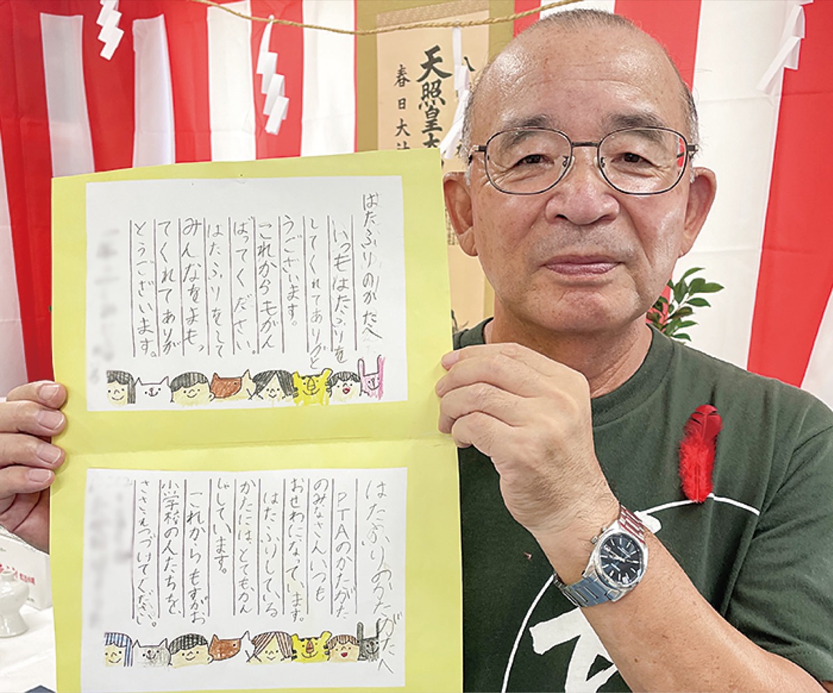 同自治会館には「まもってくれてありがとう」などと、ほぼひらがなで書かれた感謝状が2枚掲示されている。齋藤会長が見守り活動を続ける菅生小学校の1年生が国語の「感謝の手紙を書く」授業で書いた手紙だ。PTAを通して届けられた。齋藤会長は「何よりうれしい」と目尻を下げる。