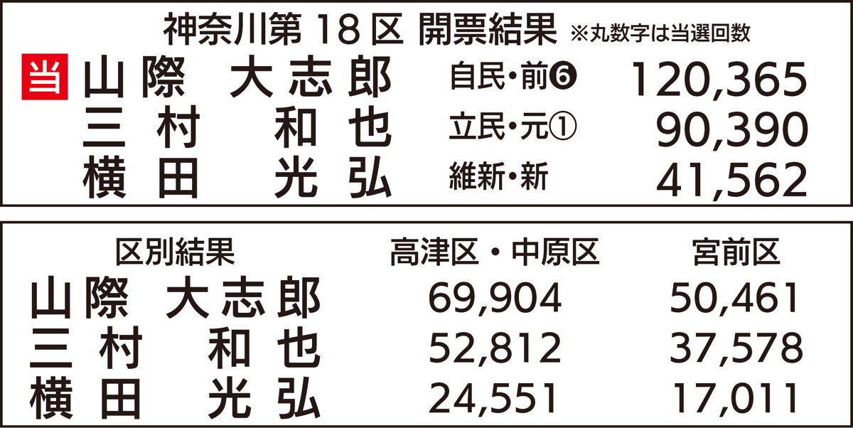 第49回衆議院議員総選挙の投開票が10月31日に行われ、神奈川18区(高津区・神木本町1〜5丁目を除く宮前区・中原区の一部)は、自民党の前職・山際大志郎氏(53)が、6回目の当選を果たした。投票率は前回を6・01ポイント上回る57・25%だった。