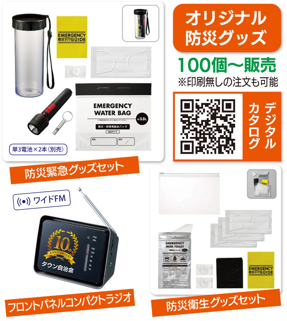 台風や大雨、自然災害への関心が集まる秋のシーズン。オリジナルグッズ制作も手掛けるタウンニュース社では、「防災グッズ」の品揃えも豊富。バッグに入るほどの大きさで、いざという時に役立つアイテムを詰め合わせた「防災衛生6点セット」(586円〜)や、ライトやウォータバッグなどの避難時に活躍する「防災緊急セット」(820円〜)、電波障害に強いラジオ(1656円〜)などを取り揃えている(それぞれ100個から販売)。自治会や学校、その他団体で配布し、備えとして持っておくと安心。商品の詳細は左上の二次元コードで確認を。