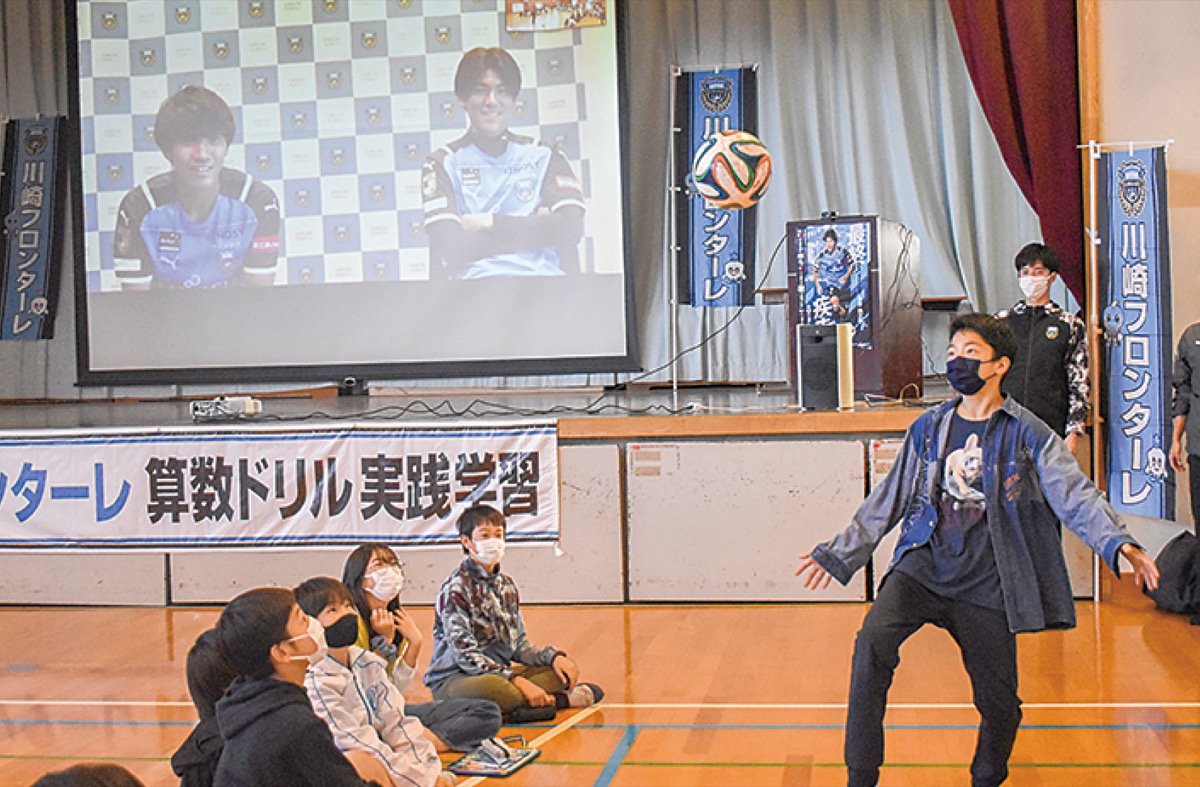 フロンターレドリルは算数と同チームを身近に感じてもらうため、2009年から市内公立小6年生に配布している。このほど来年3月まで使用する下巻が完成。麻生グラウンドと同小をオンラインでつなぎ、選手がドリルに出題されている問題に取り組んだ。