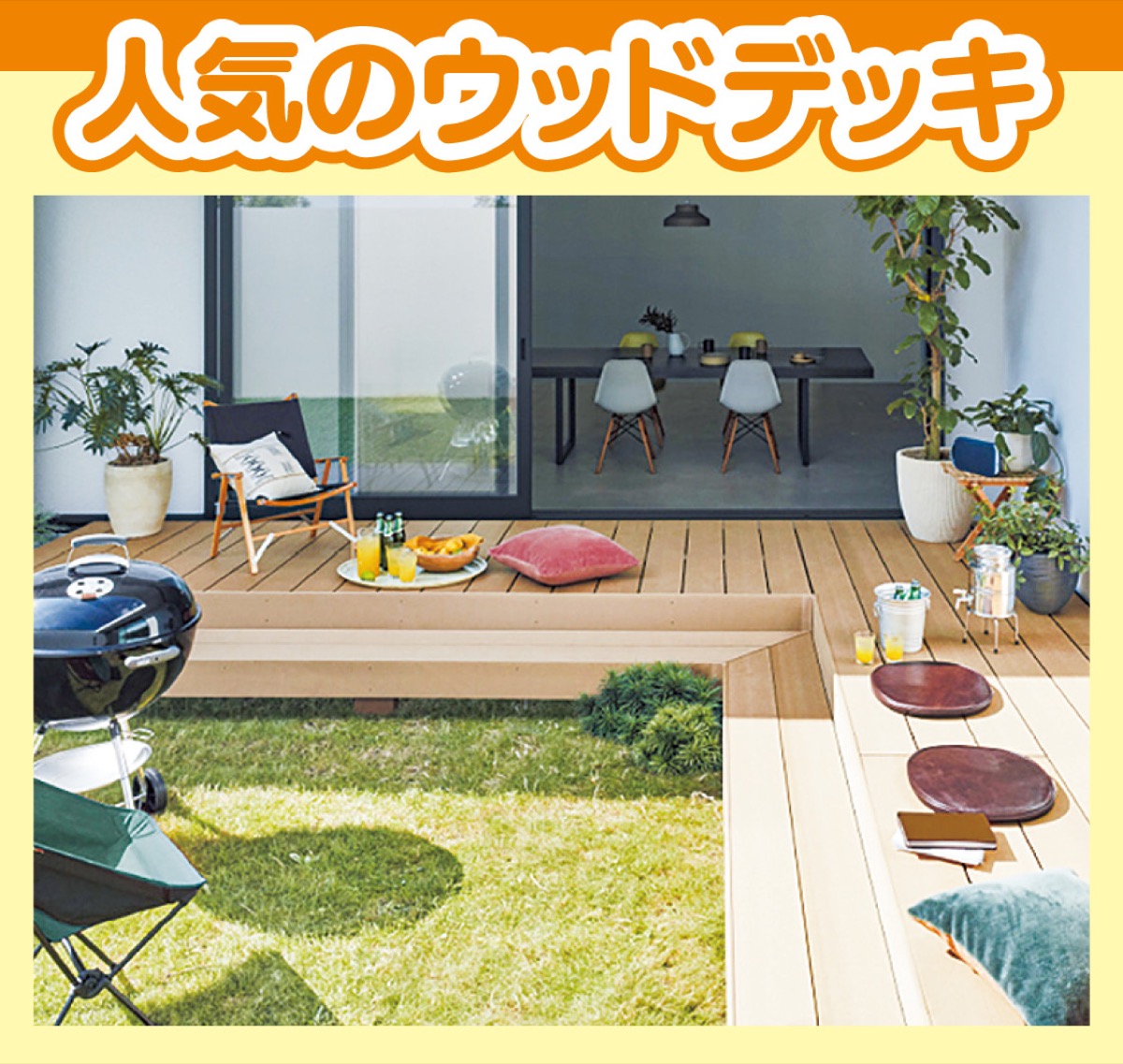 「特にウッドデッキはメンテナンス性も向上し、お求めやすい価格になっています」と担当者。問い合わせ電話の際、「タウンニュースを見た」の一言で無料出張・無料見積り実施中。