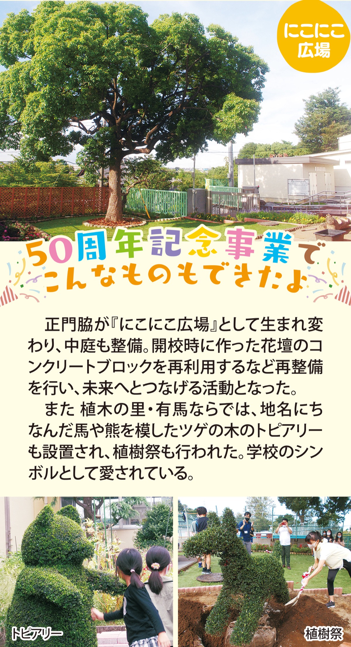 記念事業や式典などは、児童や教諭だけでなく、事務職員、栄養職員、業務職員や地域の人々らが積極的に参加し、地域一丸で創り上げられた。有馬小で芽吹いた種が、地域と共に大きく緑を茂らせていく、新たな出発となった。
