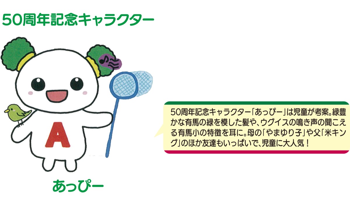 50周年記念キャラクター「あっぴー」は児童が考案。緑豊かな有馬の緑を模した髪や、ウグイスの鳴き声の聞こえる有馬小の特徴を耳に。母の「やまゆり子」や父「米キング」のほか友達もいっぱいで、児童に大人気!