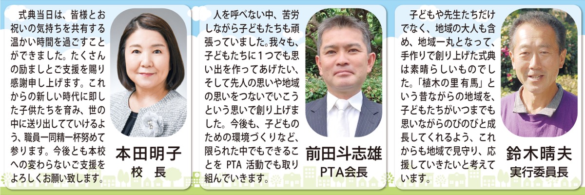 子どもや先生たちだけでなく、地域の大人も含め、地域一丸となって、手作りで創り上げた式典は素晴らしいものでした。「植木の里 有馬」という昔ながらの地域を、子どもたちがいつまでも思いながらのびのびと成長してくれるよう、これからも地域で見守り、応援していきたいと考えています。