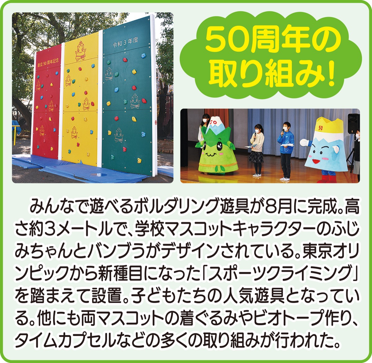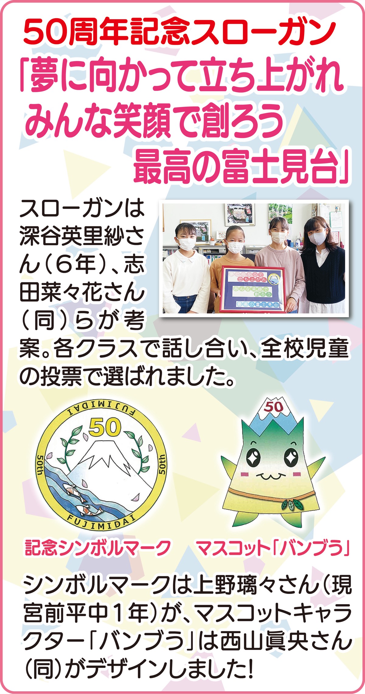 50周年記念スローガンは「夢に向かって立ち上がれ みんな笑顔で創ろう 最高の富士見台」。一人ひとりが富士見台小を最高に楽しいと思える学校にしたいという思いが込められた。