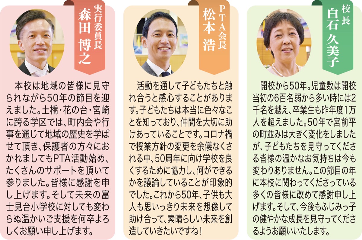 創立50周年を迎えた川崎市立富士見台小学校(白石久美子校長/児童数1094人)が11月27日、記念式典を開いた。歴代校長や学校関係者が出席し温かく見守る中、全校児童が各学年のテーマに沿った寸劇や合唱などを披露。記念日を迎えた富士見台小を盛大に祝福した。