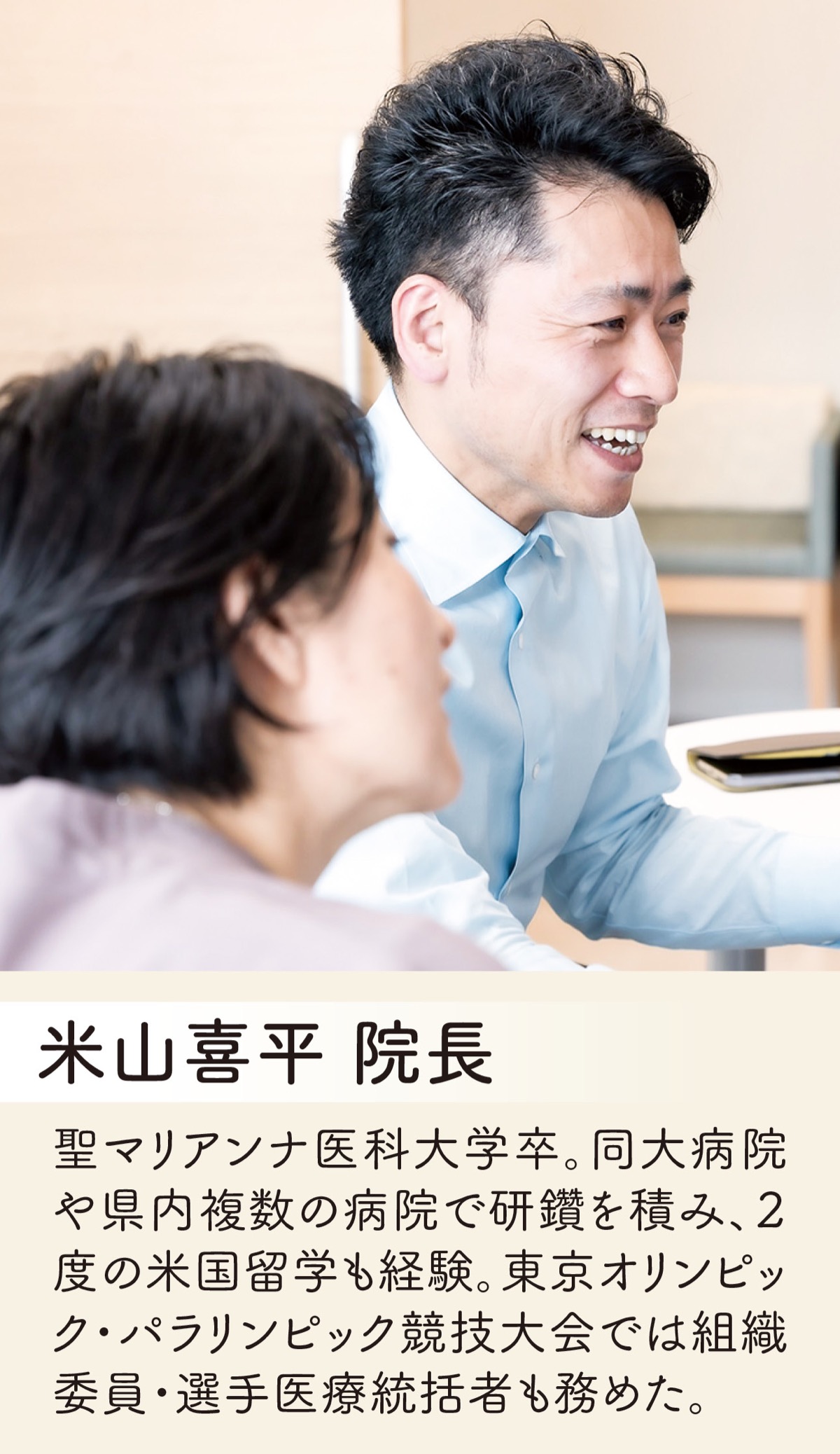 患者の言葉に耳を傾け、温和な笑顔が印象的な米山院長が掲げるのは「家族のように寄り添うクリニック」だ。「例えば、頭痛や肩こり、めまいなどは高血圧が原因になっている場合もあります。ちょっとした不調に大きな病気が隠れている場合もあります。紹介状不要なので、『この程度で相談していいのかな』と悩まず、むしろ不調がなくても『かかりつけ医を探しに来た』くらいのお気持ちでお越しください」。院内は2つの診察室で患者の動線を分けるなど感染対策を十分に考慮し、通院患者なら発熱している場合でも診察を受けられる。