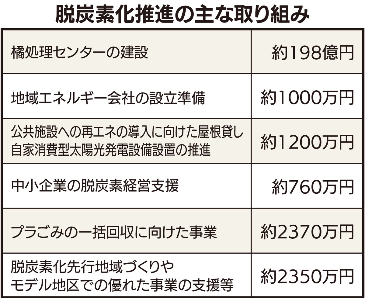 市が出資し、23年度の設立を目指す「地域エネルギー会社」の準備に約1000万円、プラスチックごみの一括回収に向けた取り組みには約2370万円、環境などに配慮した企業・事業等への投融資(ESG投融資)の促進による中小企業の脱炭素経営支援には約760万円を充てる。約3200万円を計上した「水素戦略」では臨海部全域の脱炭素化を進め、環境保全と産業振興の両立を図る。