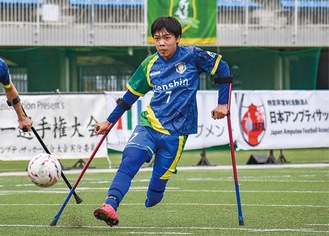 犬蔵中学校に通う石井賢さん(3年)が19日と20日、富士通スタジアム川崎(川崎区)で開かれた第10回日本アンプティサッカー選手権大会2021に出場。アシストを決めるなど、所属するFCアウボラーダの優勝に貢献した。