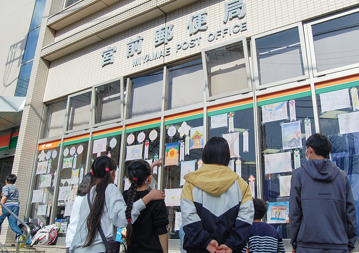 宮前郵便局の通り沿いのガラス張り壁面に3月18日、絵画が掲示された。西有馬小学校の4年2組の児童が、有馬地域をより良くしていこうと募ったもの。