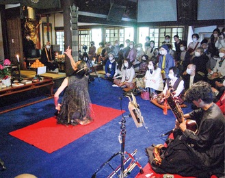 田中さんは「エンターテイメント要素は皆無、邪心が入らないよう演奏した。神仏の前での演奏は丸裸にされる思い。貴重なご縁をいただき、これからも続けられたら」と振り返った。OBAさんは「体を動かされるままに、場のエネルギーに任せて舞った。不動明王を祀り、古くから祈りを捧げられてきた場の力は凄まじかった。この場の良い力が波紋となり広がって浸透していけば」と思いを語った。