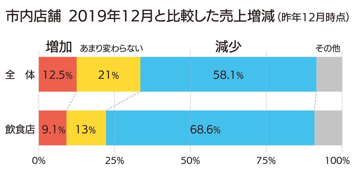 コロナ禍の来客数や売り上げの増減については、2019年12月との比較で、20年12月と21年12月ともに減少したとの回答が55%超。業種別で見ると、飲食店では減少の割合が68・6%と他の業種より10%以上高く、大きな影響を受けたことが分かった。