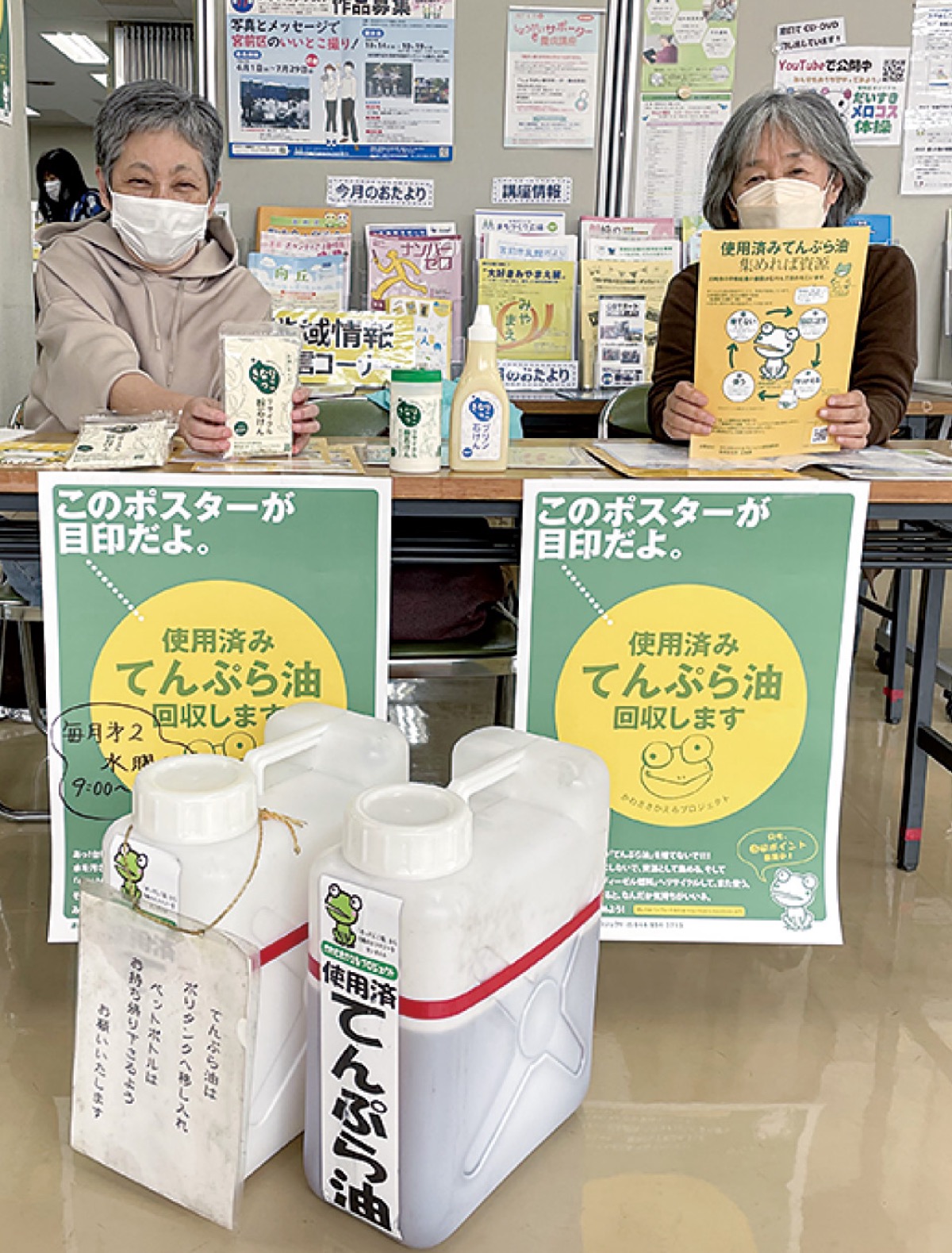 宮前区内各所で使用済みてんぷら油の回収が行われている。活動を行っているのは、かわさきかえるプロジェクト。回収した油は、せっけんやバイオディーゼル燃料などにリサイクル。希望者には石鹸が進呈される。
