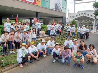 土橋園芸クラブがいつも手入れをしている花壇。今回は子ども会も作業を手伝い、過去最高の50人が植栽を行った。モニュメントを中心に、『40』の文字や花火をイメージした円を、ペンタスやベゴニアで紅白に彩った。ほかにマリーゴールドやムスカリなど969株を植え付け、記念看板も設置。参加した萩野智久さん(富士見台小6年)は「お祝いする気持ちでみんなで協力して植えたので、ぜひ見てほしい」と話した。