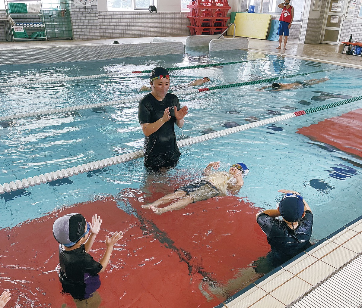 インストラクターが水着と着衣で泳いで見せると、児童らは「水着の方が早い」と回答。服を着てプールに入り、服に空気を入れて浮く方法や、ペットボトルを使った浮き方などを学んだ。インストラクターは、事故に遭わないために「水辺で遊ぶ際はライフジャケットを着用」「水に落ちたら慌てず仰向けで浮いて助けを待つ」「友人が落ちた際は、自ら助けに行かずに仰向けで浮くよう声をかけ、浮くものを投げて大人の助けを呼ぶ」などが重要と話していた。