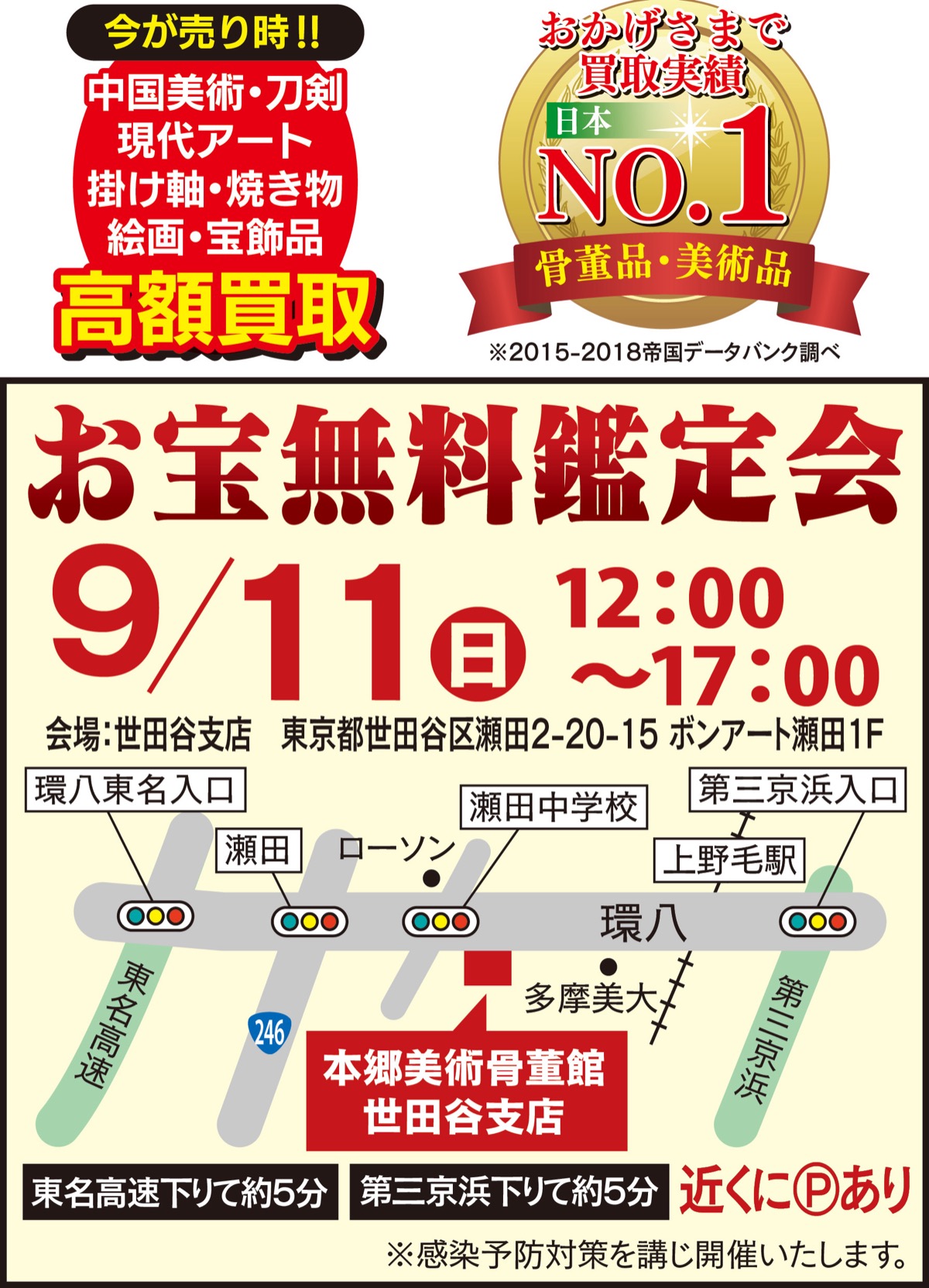 本郷美術骨董館 世田谷支店では9月11日(日)、「お宝無料鑑定会」を開催する。同店は東大赤門前で創業40年になる美術品や骨董品の専門店。