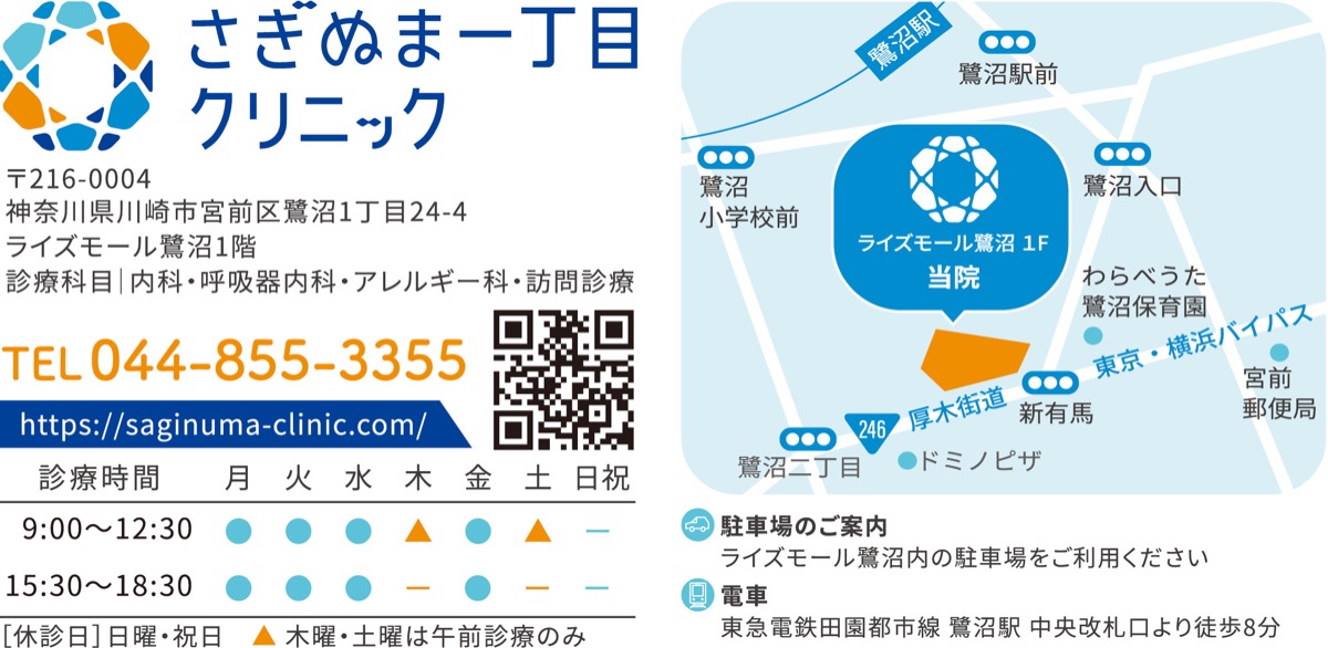 高津区にある「そめや内科クリニック」の分院として、「さぎぬま一丁目クリニック」が11月1日、食品館あおばが入るライズモール鷺沼1Fに新規開院した。