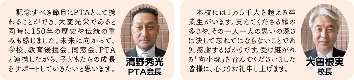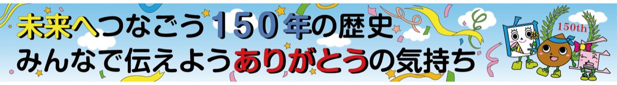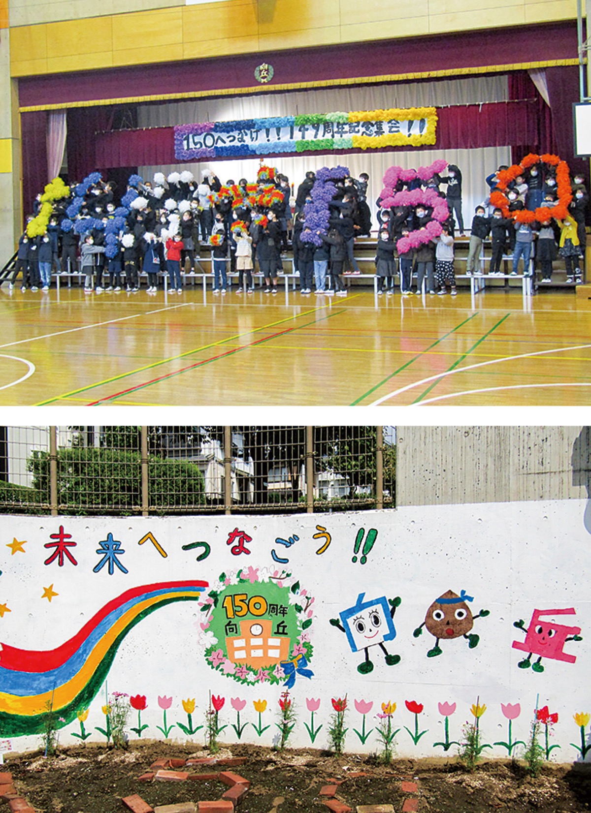 節目となる150周年を祝おうと、児童たちは昨年3月にスローガン「未来へつなごう150年の歴史 みんなで伝えようありがとうの気持ち」を決定したのを皮切りに「正門前壁画」や「記念ソング」「シンボルマーク」の制作などの記念事業を行ってきた。今年1月には149年記念集会を実施して、式典に向けて準備を進めてきた。