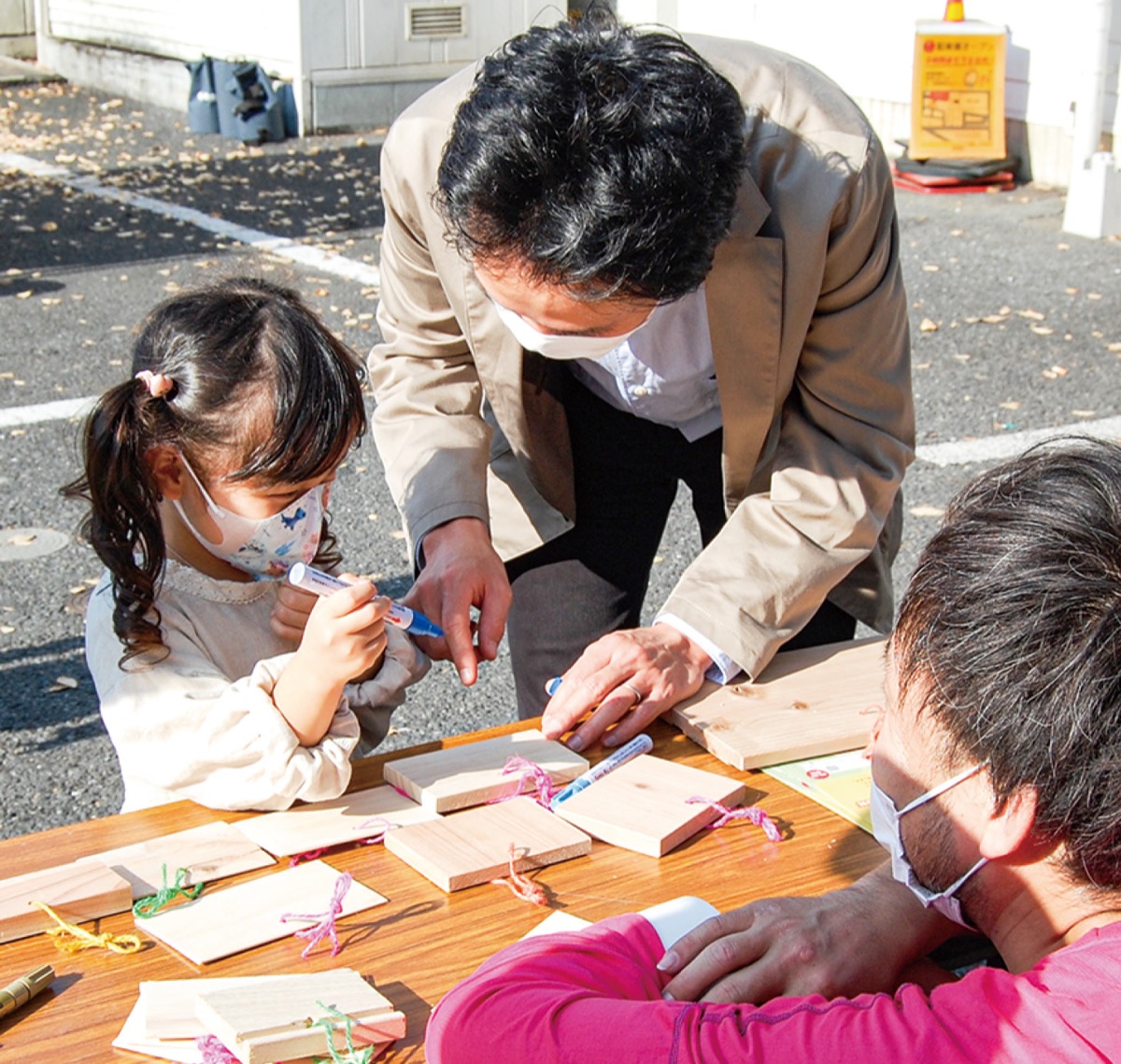 11月12、13日に開催された地域周遊型イベント「スイッチ!サギヌマ」。鷺沼駅前会場には、まちづくり神社が登場した。廃木材を絵馬に加工して「鷺沼の街にあってほしいこと」を書いて飾る企画。溝口から家族で食事に来た際に立ち寄ったという安本有那さん(4歳)は「ゆうなちゃんが元気ですごせますように」と父親が書いた絵馬にイラストを描いていた=写真上。高校1年の女子3人組は「屋上芝生がほしい」と書いていたほか、「早く鷺沼に区役所が来てほしい」「やさしいまちに」などの願いが飾られ、初日昼過ぎには絵馬がぎっしりと並んでいた。
