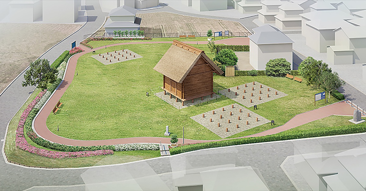 工事は、たちばな古代の丘緑地とその西側隣接地における史跡整備として、7世紀後半に建てられた倉庫の1棟を復元する。ほか3棟は土台となる柱のみ立体表示。茅葺屋根などは薬剤を塗布するなど、長持ちする工夫を考えているという。舗装された園路や植栽、休憩用のベンチ等、遺跡群の説明版なども整備する予定だ。