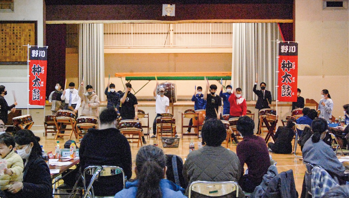 当日、市内各地のイベントなどで太鼓のステージを披露している「野川种太鼓」が演奏。在学中に授業で習い、卒業後も有志が週に1回練習に励んでおり、スーツ姿などで飛び入り参加する卒業生の姿も見られた。