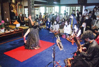 この日は釈迦の誕生日とされ、仏教寺院では全国的に「花まつり」として法要が行われる。同院では昨年から法要の後に演奏舞を奉納しており、前回は130人ほどが本堂での奉納演奏舞に見入った=写真。