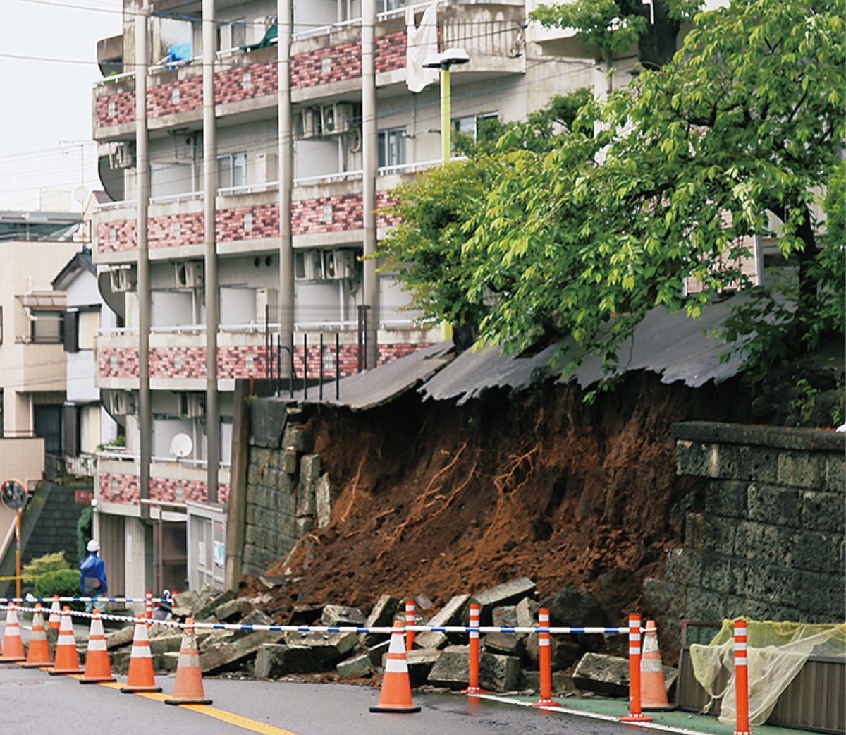 市担当者によると、現場は市が発行する土砂災害ハザードマップ掲載の警戒区域には当てはまらない場所。大雨の何らかの影響で擁壁が崩れたものとされる。擁壁に関する防災対策として、市では所有者に維持管理を呼びかけるほか相談会を実施。擁壁の改修、補強工事には「宅地防災工事助成金制度」として費用の助成を行っている。