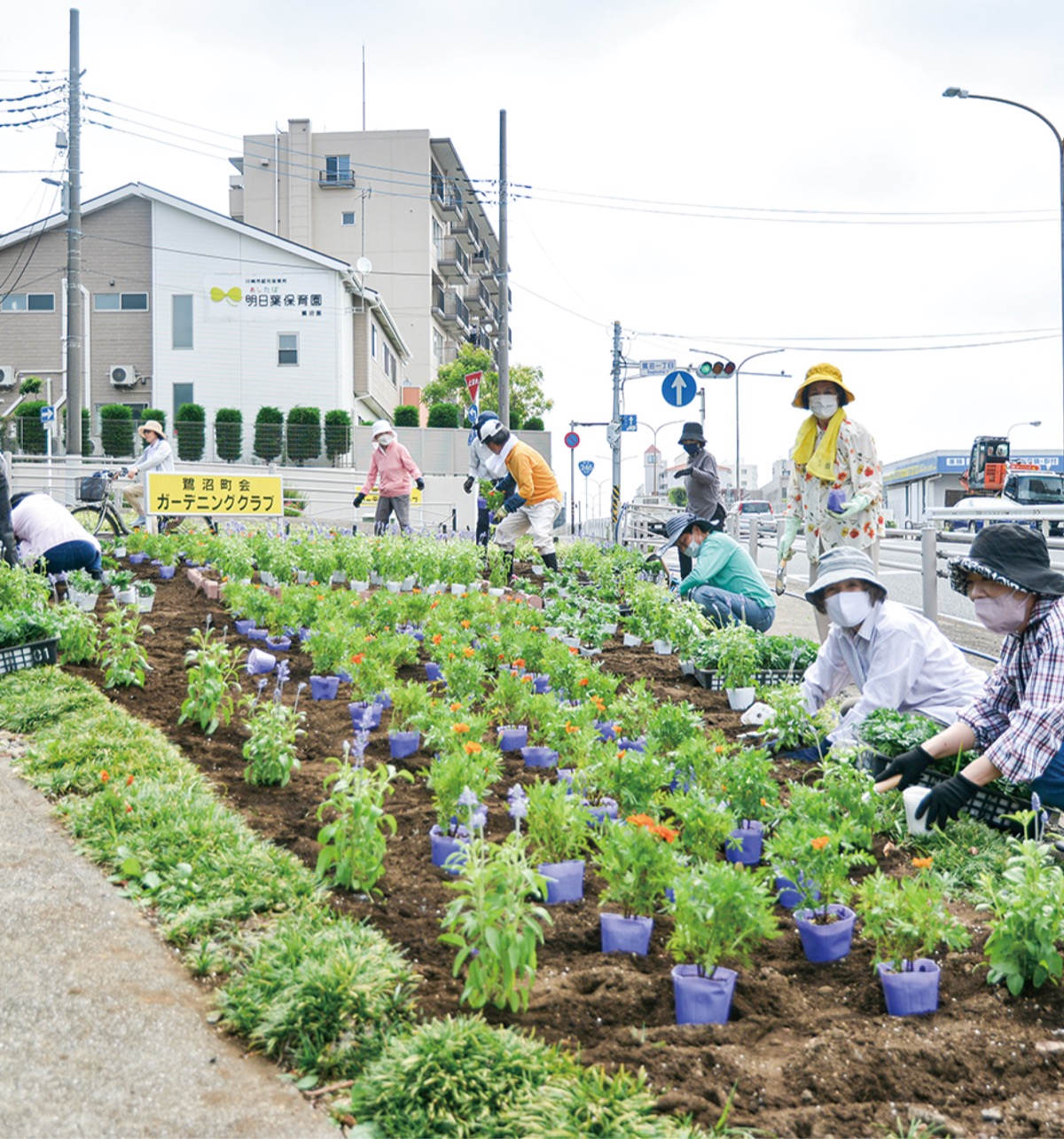鷺沼町会ガーデニングクラブが6月24日、国道246号線「鷺沼一丁目」交差点そばの花壇で、植え替えを行った。