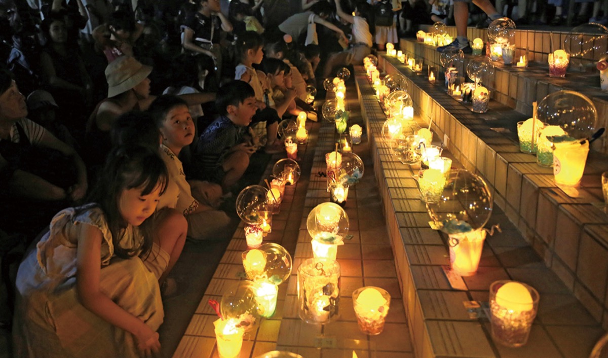 コロナ下で夏まつりを体験できなかった子どもたちに楽しんでもらおうと、市民団体mama-on!(ママオン)事務局が主催。小学生と保護者ら143人が、LEDキャンドルを入れる台座づくりに挑戦。日が落ちると完成作品を庁舎前の階段に並べ、夜に浮かぶ光を見て楽しんだ。小6の女児は「たくさんの光がきれいだった。小学生最後の夏休みのいい思い出になった」と話した。
