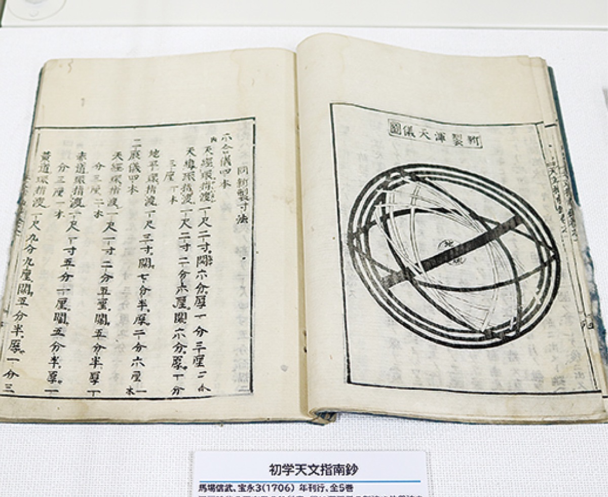 毎月1本ペースで、天文担当職員がプラネタリウム番組を制作し、生解説で投影している同館。2階学習室では「テーマ選定」「調査研究」「構成と演出」といった番組ができるまでの一連の流れを紹介している。また、1706年に刊行されたとされる天文学の教科書「初学天文指南鈔」も展示している。