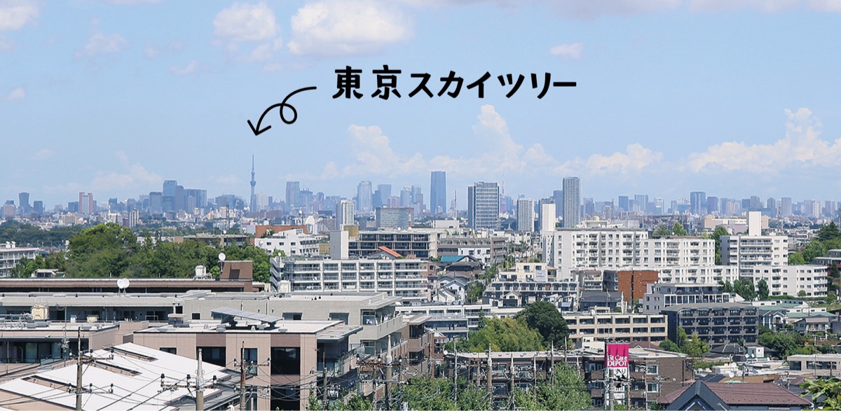 高台にある同公園は、周囲に同じ高さの建物がないこともあり、見晴らしが良い。8月3日に訪れたところ、展望スポットから東北東に、東京スカイツリーや東京タワーを見ることができた。