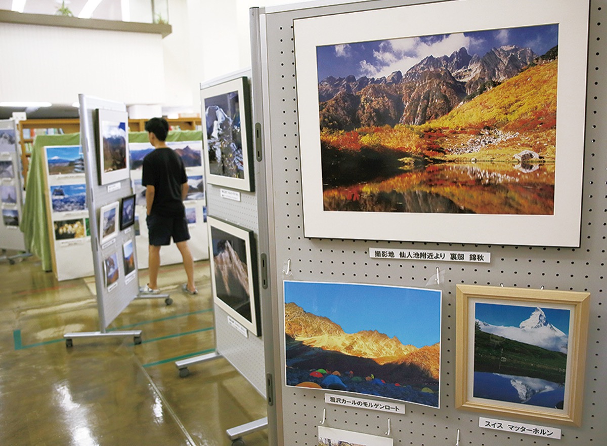 「みやまえ山岳展覧会」と称し、市民らから寄せられた103点をカウンター近くに展示。剱岳や槍ヶ岳、スイスのマッターホルンなど、国内外の山のさまざまな風景を楽しめる。山岳に関する書籍や雑誌を手に取ることもできる。