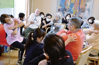同グループはコロナ下、外部と連携することで身体の機能低下を防ぐ取り組みを推進。その一つが、地元のトレーニングジム・SP―Bodyと連携し、1月に本格導入した「バナトレ」だ。女性特有の健康課題の解決のための運動療法が組み込まれており、同グループは筋力の衰えで生じる骨盤内蔵器脱や膀胱炎、尿漏れ対策に取り組んでいる。体験会では同ジムのトレーナー・太田藍さんが講師に招かれ、「声を出すことで横隔膜と骨盤底筋群が一緒に動く」と説明。入居者らは『ふるさと』を歌いながら、椅子を利用したストレッチなど、日ごろの取り組みを披露した。