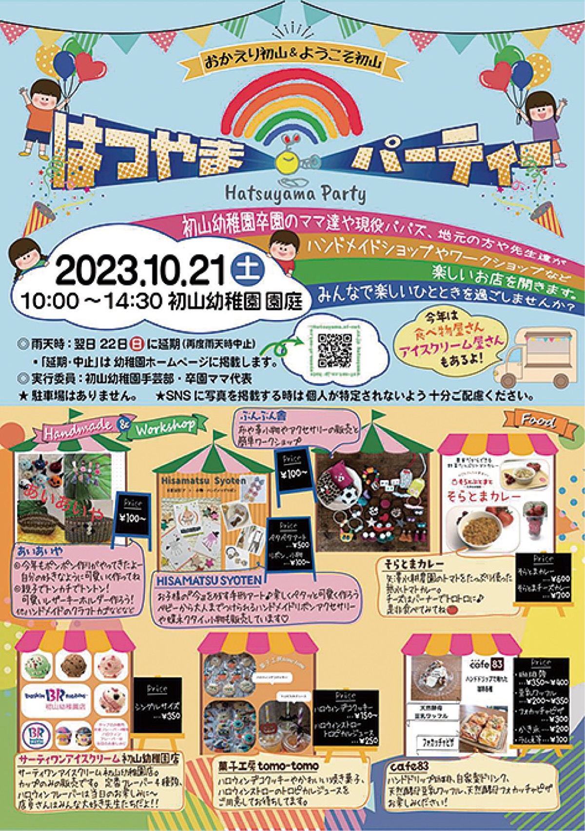 初山幼稚園(初山1の2の1)園庭で10月21日(土)、「はつやまパーティー」が開催される。午前10時から午後2時30分まで。
