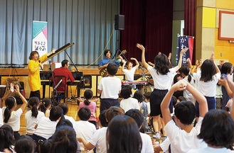 川崎市内各地で公演される「かわさきジャズ2023」の出張企画。ラテン音楽を取り入れた、ピアノとドラム、ギターのジャズトリオの演奏に、児童は歌ったり踊ったりして盛り上がった。
