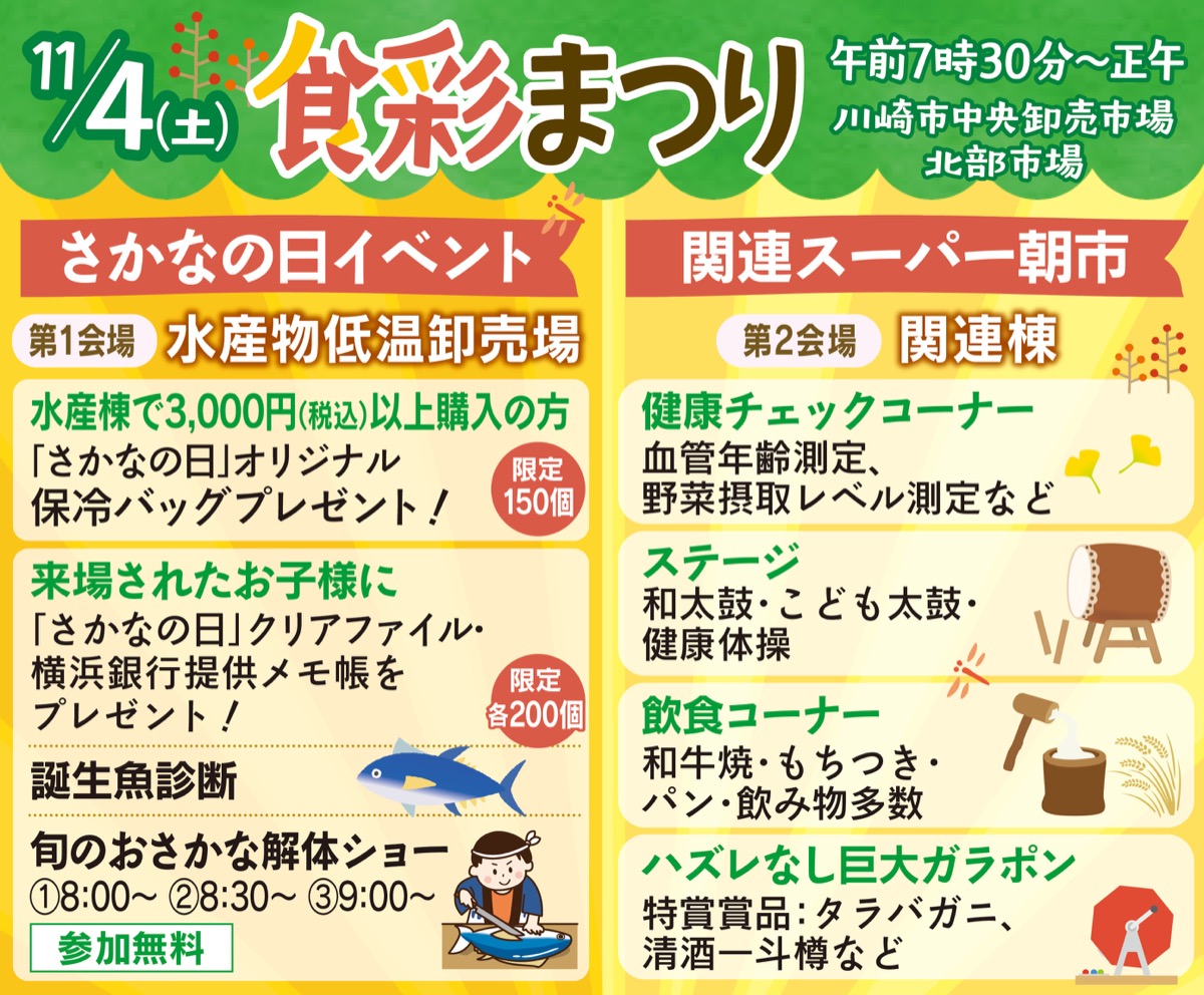 川崎市中央卸売市場北部市場(水沢1の1の1)で11月4日(土)、「食彩まつり」が開催される。午前7時30分から正午まで。今回は水産と関連が共同開催し、パワーアップ。恒例の朝市に加えて、市場グルメが楽しめるほか、お得なイベントが目白押しだ。
