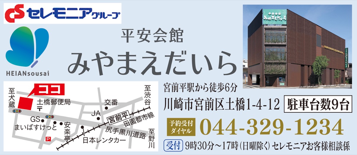 川崎で創業74年。全区に式場を展開し、地域に寄り添い「安心」と「信頼」を届けるセレモニアグループの平安会館。『みやまえだいら』では、11月17日(金)に遺影写真撮影会が開催される。