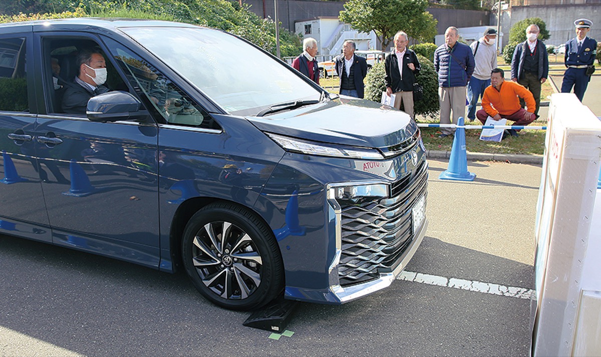 当日は約20人が参加し、トヨタ社のサポカーに乗車。アクセルとブレーキを踏み間違え、車止めに乗りあげてしまった場合の急発進抑制と、進行中の前方に障害物があった場合の衝撃被害軽減ブレーキを体験した。車体を横から見て、障害物との距離や、ブレーキがかかったときの状況を観察する姿もあった。