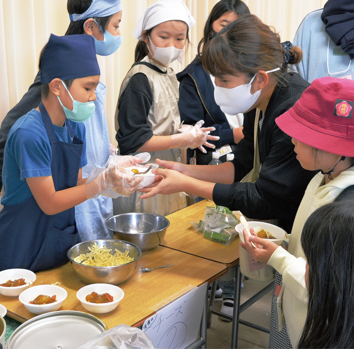 5年生は自然教室で作ったカレーの味を追求しようと、クラスごとに味や食材にこだわった。フェスでは、アレルギー対応のためにトッピングを後乗せしたものなど、オリジナルカレーを200食提供。2組は近隣農家の協力を得て、試行錯誤の末に地場野菜を使ったカレーを完成させた。「いらっしゃいませ」。当日は、飲食店を営む保護者から接客の心得を学んだ成果を発揮していた。