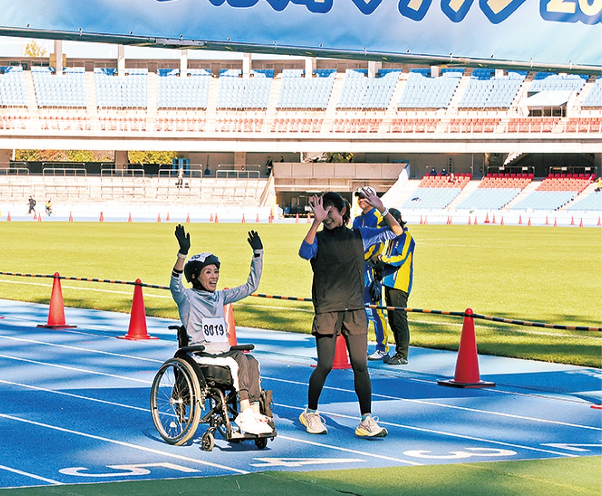 市制100周年のプレ大会として、「誰もが楽しめるインクルーシブな大会」を掲げた今回。新設された車いすランの部には19人が参加した。親子で挑戦するファミリーランには393組786人が参加し、ゴールした。