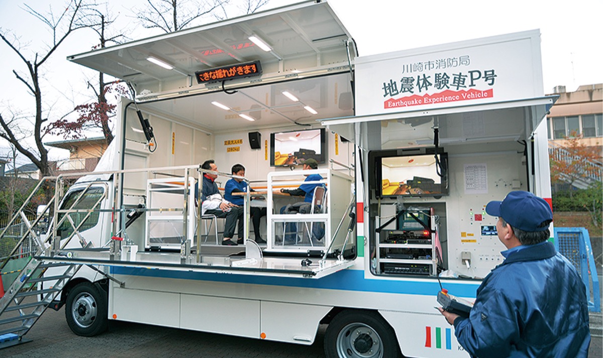 15回目となる今回は、親子など約100人が参加。起震車に乗り込んだ男性グループは、震度4〜7の揺れに驚いた表情で「立っていられない。自宅の備えを強化しないといけない」と話した。会場には神奈川県内で1台しかないという「交通安全教育車」も設置され、参加者は、運転の疑似体験や反射神経測定などを行った。