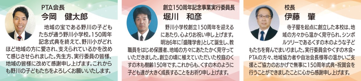150周年を祝うため、PTAや、地元住民による「くすの木会」などが中心となり、「創立150周年記念事業実行委員会」を組織。式典準備をはじめ、記念誌、副読本発行などに尽力してきたほか、学校旗を新調して寄贈。紺地の旗には「美しい自然と花にかこまれた平和な野川に」という思いが込められた桜をかたどった校章が、金の刺繍で施されている。